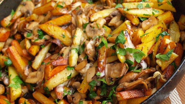- На завершающем этапе к картошечке добавляют грибную смесь, солят и перчат, накрывают сковородку крышкой и готовят на среднем огне еще 5 минут.