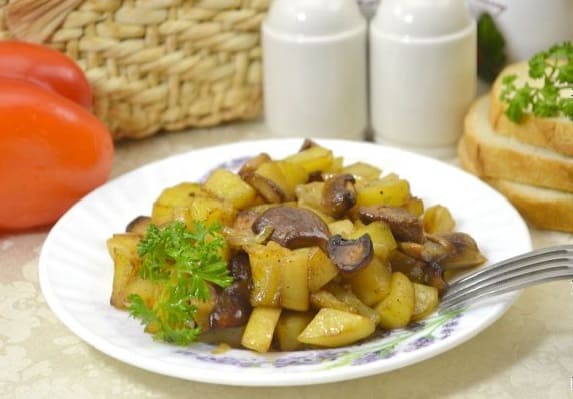 Жареные блюда нравятся не всем. Грибы с картошкой можно не только жарить, но и тушить. В результате калорийность и вкус блюда сохраняются, а вредных жиров в нем содержится меньше.