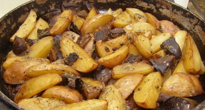 - На сковородку с раскаленным маслом выкладывают картофель и жарят 6 минут. Далее выкладывают лук и готовят еще 5 минут. В конце добавляют грибы, солят и перчат смесь, накрывают крышкой и томят на небольшом огне 20 минут.